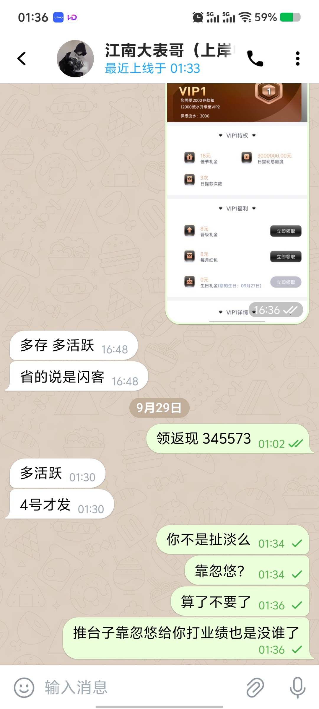 说今天返现,发消息也不回